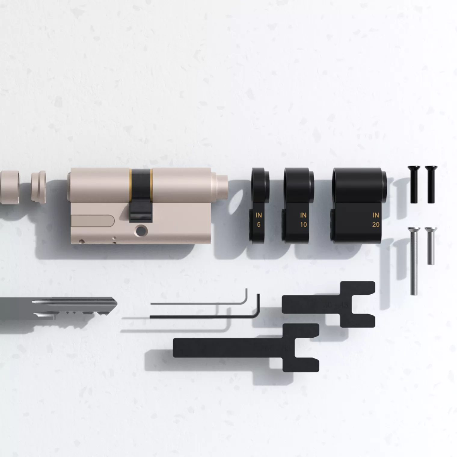- Regulowana wkładka Linus® - gwarantuje współpracę z zamkiem Linus® Smart Lock. Nie ma potrzeby mierzenia drzwi, ponieważ wkładka regulowana jest zaprojektowana tak, aby dopasować się do Twoich drzwi.