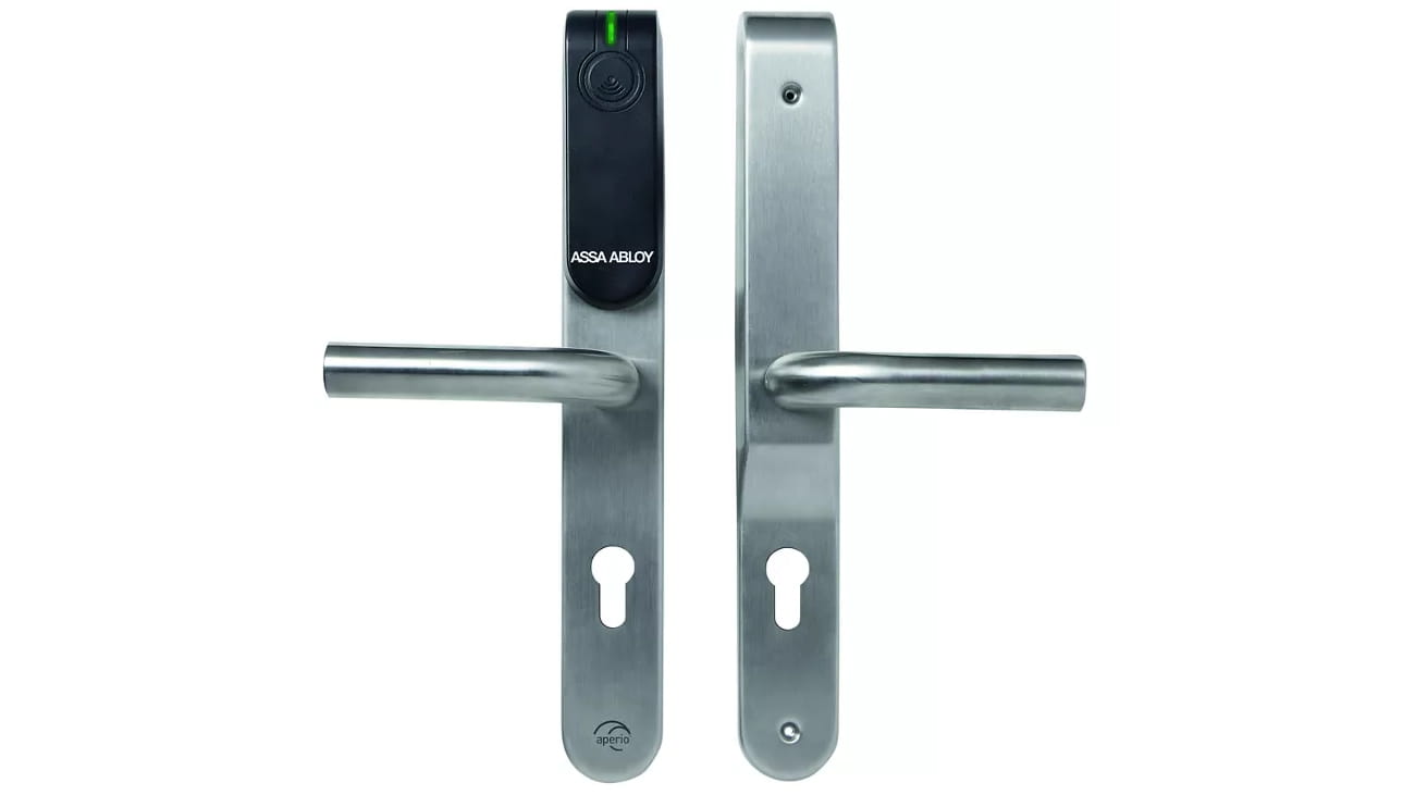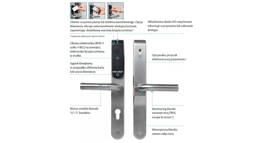 Okucie do drzwi Aperio E100 jest dostępne w wersjach Standard i Premium. Zarówno z opcjami prywatności, jak i PIN-padem.