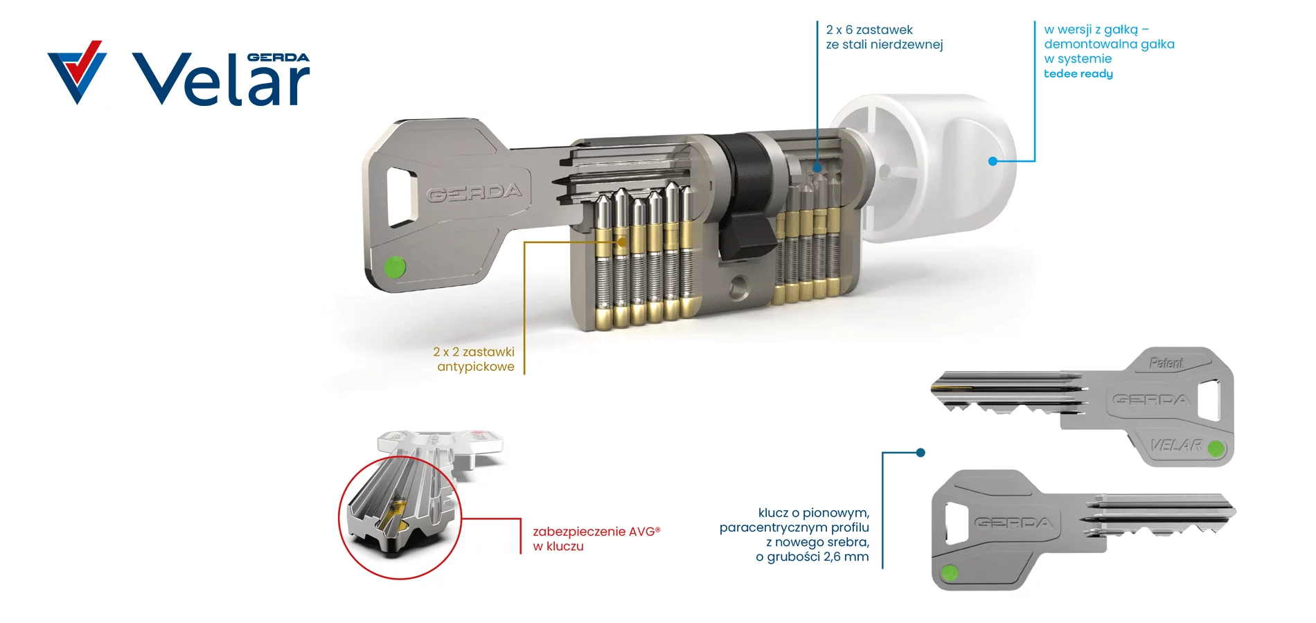 Klucze Gerda Velar - unikalną cechą Gerda Velar jest zabezpieczony przed podrobieniem (opatentowaną technologią) klucz, który współpracuje ze specjalną zastawką AVG® – Acces Verification Gate. Dorobienie kluczy jest możliwe jedynie w autoryzowanych punktach za okazaniem karty bezpieczeństwa. Klucze są sprzedawane osobno. Chcąc kupić więcej kluczy kliknij "Klucz Gerda Velar"