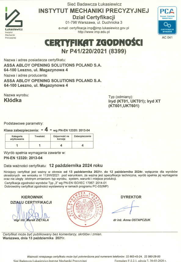 Atest: Klasa 4 (wysoka odporność na włamanie)