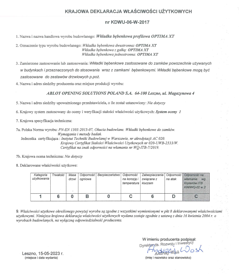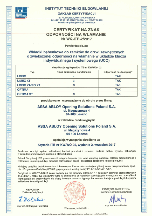 Wkładki bębenkowe z serii Optima XT to flagowe rozwiązanie firmy LOB, należącej do międzynarodowej grupy Assa Abloy. Charakteryzują się one najwyższymi ocenami według europejskich norm PN-EN 1303:2015-17 oraz posiadają atest antywłamaniowy klasy C (najwyższy), wydany przez Instytut Techniki Budowlanej.