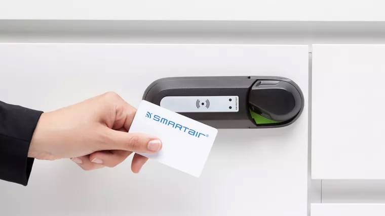 Zamki do szafek SMARTair zabezpieczają szafki, szuflady, komody i szafy. Zamek ten jest zintegrowanym zamkiem i czytnikiem kontroli dostępu z diodą LED (sygnał zielony/czerwony) i odległością odczytu/zapisu równą 1cm. Wszystkie elementy sterujące, w tym baterie, znajdują się wewnątrz, co zapewnia większe bezpieczeństwo i ochronę przed wandalizmem.