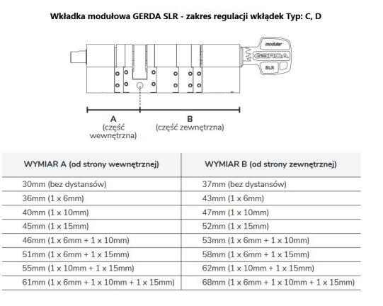 Wymiar wkładki C to regulowane 30mm-61mm od strony wewnętrznej mieszkania oraz to regulowane 37mm-68mm od strony zewnętrznej (od strony klucza).
