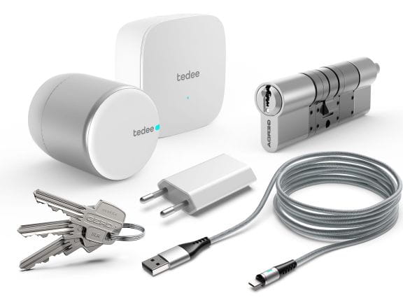 AkcesoriaZamówiony zestaw tedee powered by GERDA wyślemy pod wskazany adres wraz z kompletem akcesoriów. W zestawie znajdziesz 3 klucze do wkładki, 1 przewód micro-USB z magnetyczną końcówką, dzięki której możesz swobodnie korzystać z zamka podczas ładowania, zestaw kluczy do samodzielnego montażu oraz ładowarkę sieciową. |